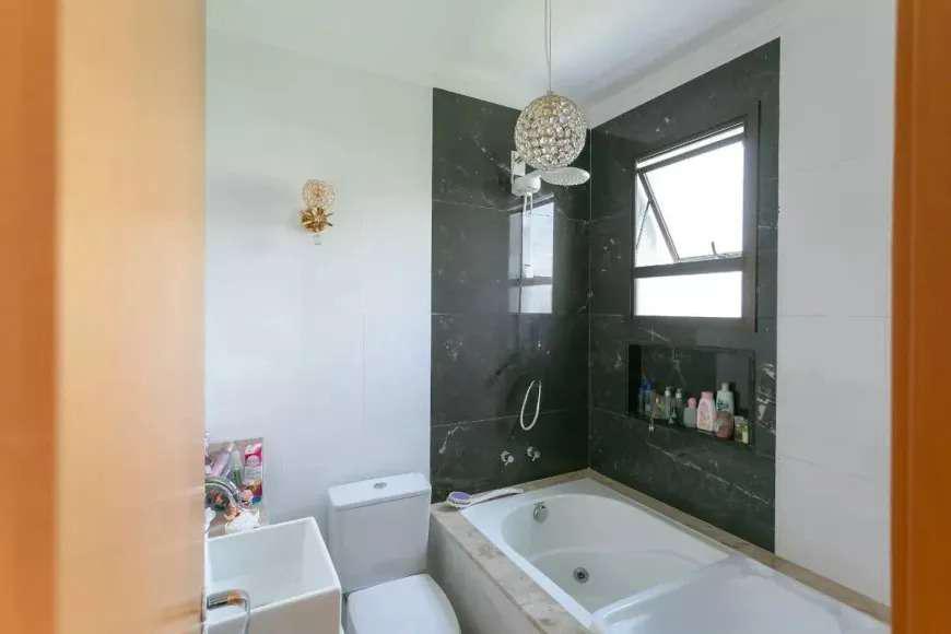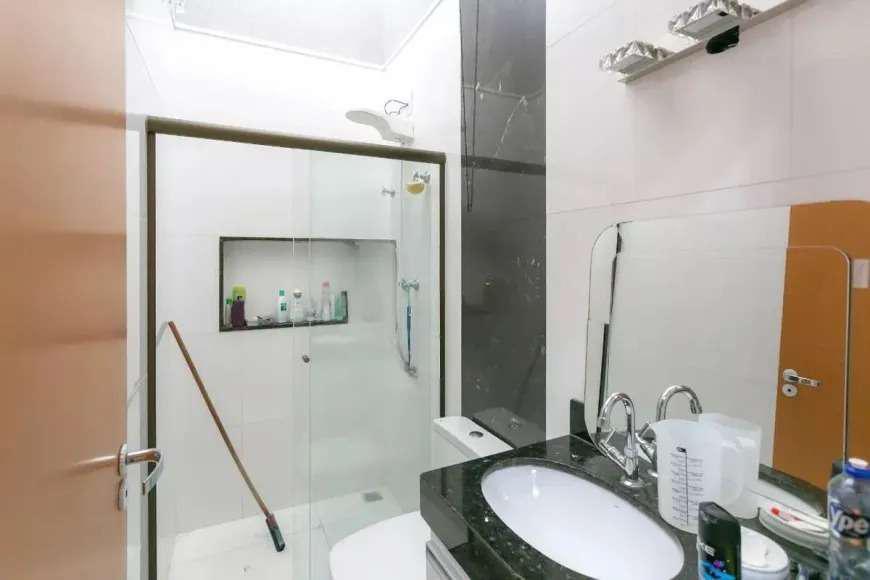 Banheiro social com acabamento em cerâmica, armário e box em Blindex.