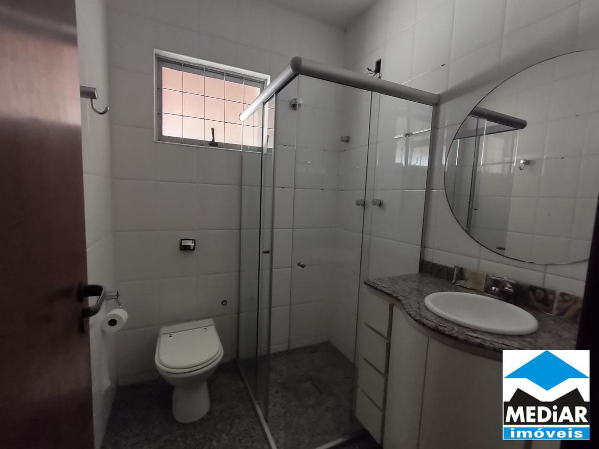 Banheiro da suíte com box em vidro temperado, bancada em granito e armário;