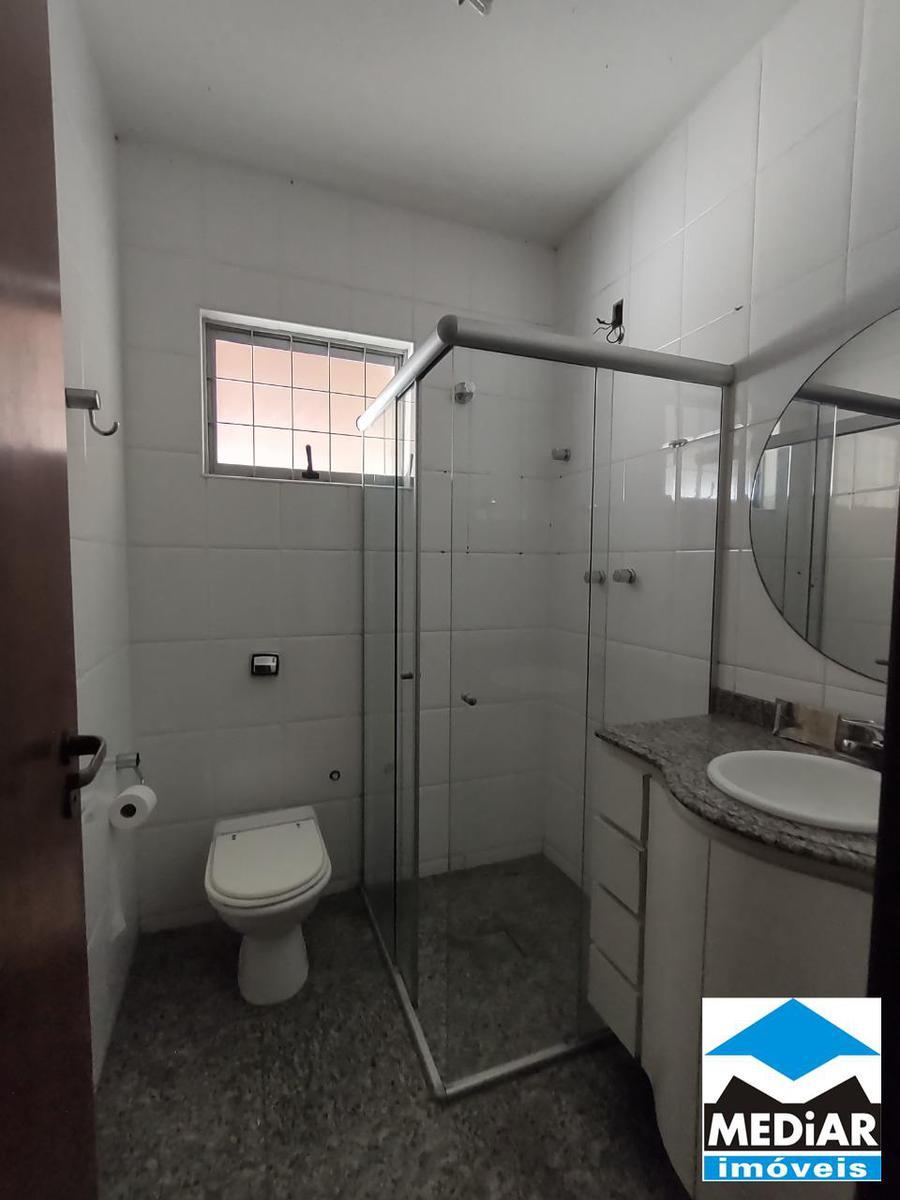 Banheiro social com box em vidro temperado, bancada em granito e armário;