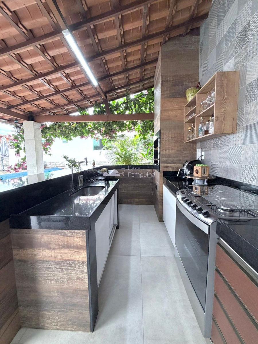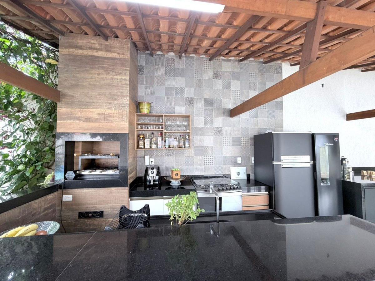 - Espaço gourmet coberta composta por bancada em granito em formato de apoio, armários planejados e prateleiras com nichos. O espaço conta com churrasqueira revestida.