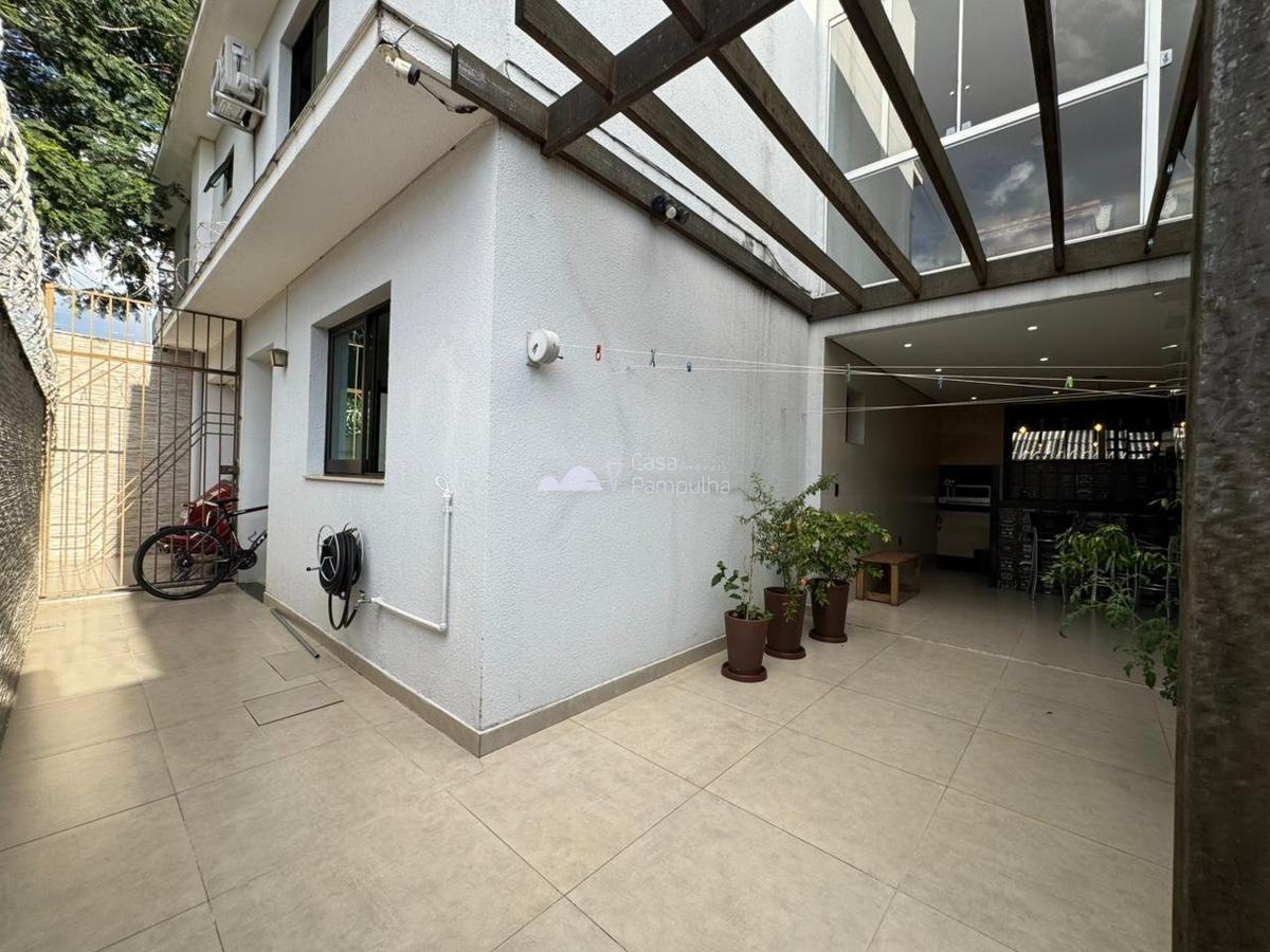 Área externa com espaço gourmet coberto, salão de jogos, área de serviço coberta e jardins.