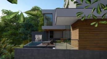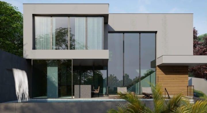 1º Pavimento: Sala ampla dividida em dois ambientes, cozinha, lavabo, espaço gourmet, varanda, deck, piscina, garagem livre e coberta para dois carros, área de serviço e depósito.