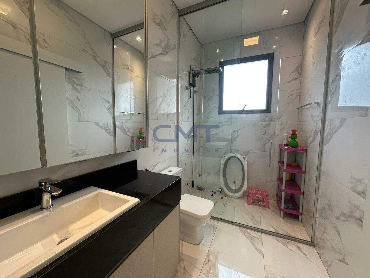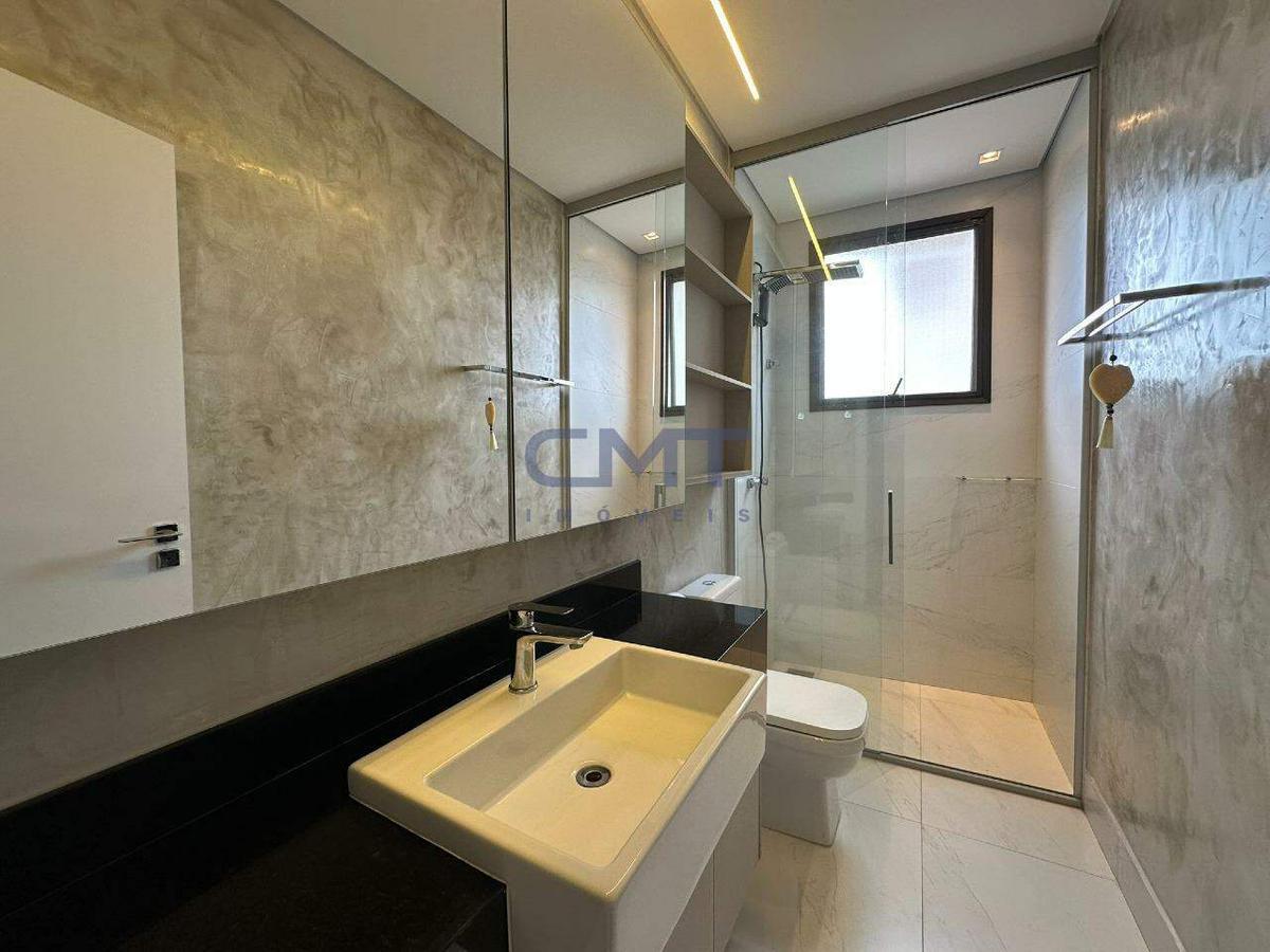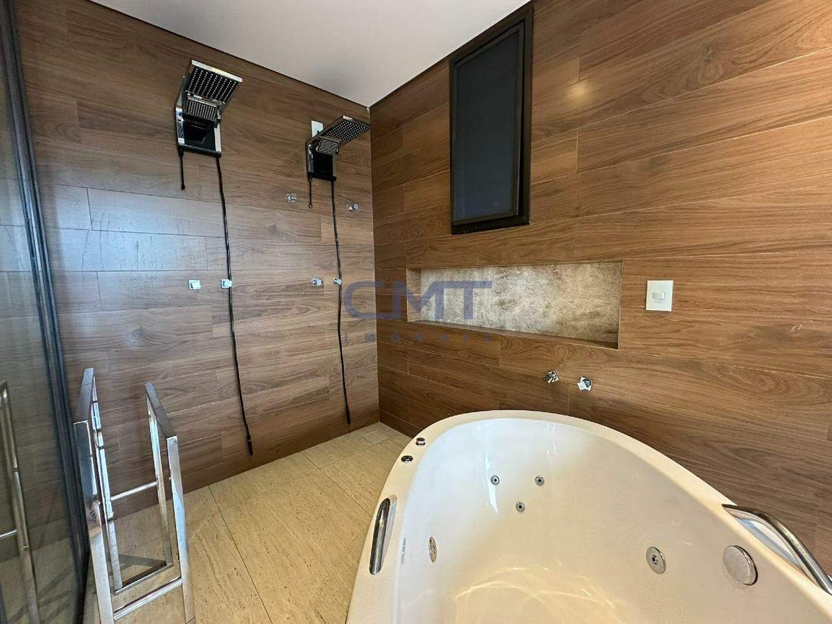 Suíte máster conta com bancada em mármore com cuba dupla, closet e hidromassagem.