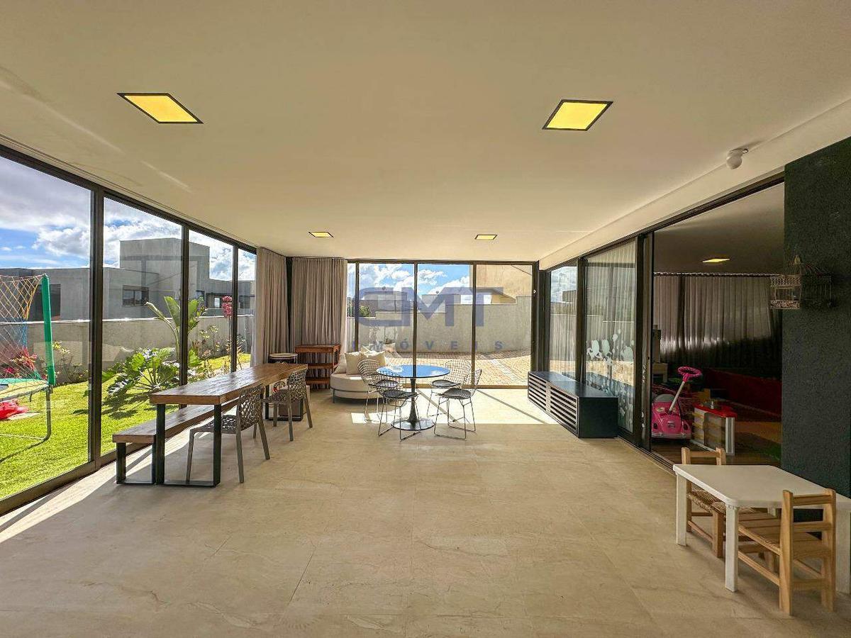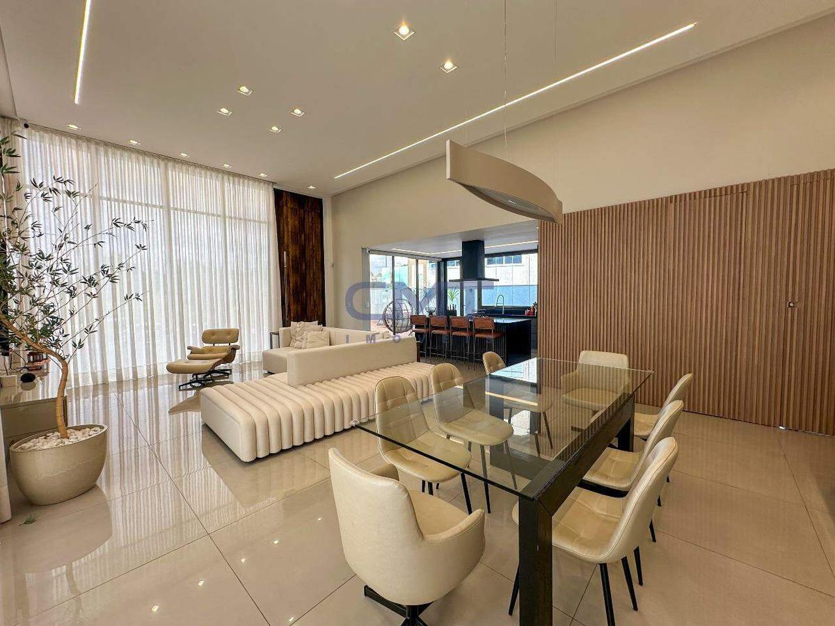 Sala espaçosa, com pé direito duplo integrada com a cozinha, com uma ilha gourmet que conecta toda a casa. Iluminação planejada em teto de gesso, piso em porcelanato de extremo bom gosto. Conta com dois lavabos, sendo um interno e um externo. Por toda a sala e cozinha temos fechamentos em vidro que dão acesso à área externa, que conta com piscina aquecida, área gourmet, churrasqueira e uma vista incrível para as montanhas.