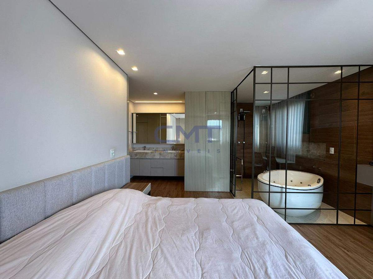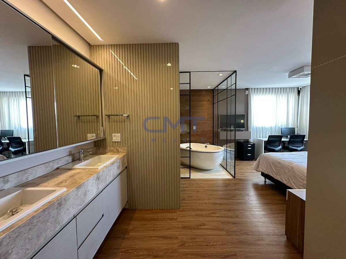 Suíte máster conta com bancada em mármore com cuba dupla, closet e hidromassagem.