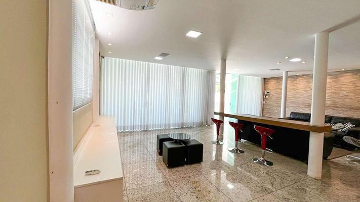 Sala ampla para três ambientes, com piso em granito e iluminação personalizada.