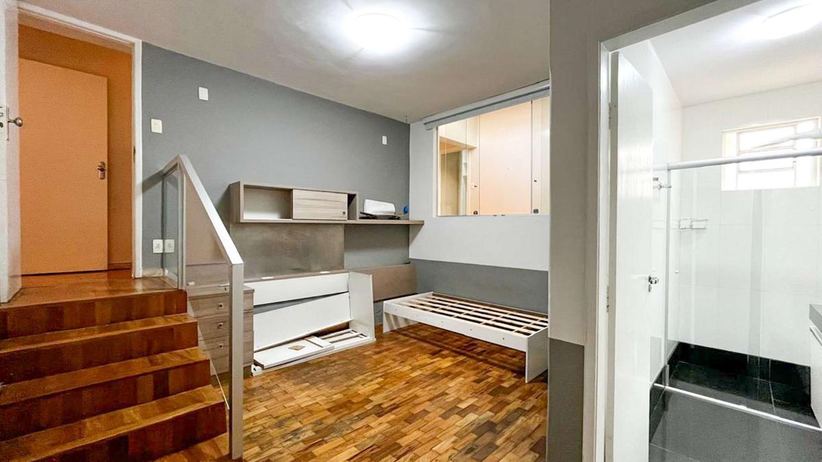 Segunda sala de estar, integrada a uma cozinha e área de serviço com armários.