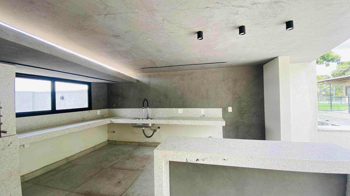 Cozinha moderna com porcelanato e bancada em granito.