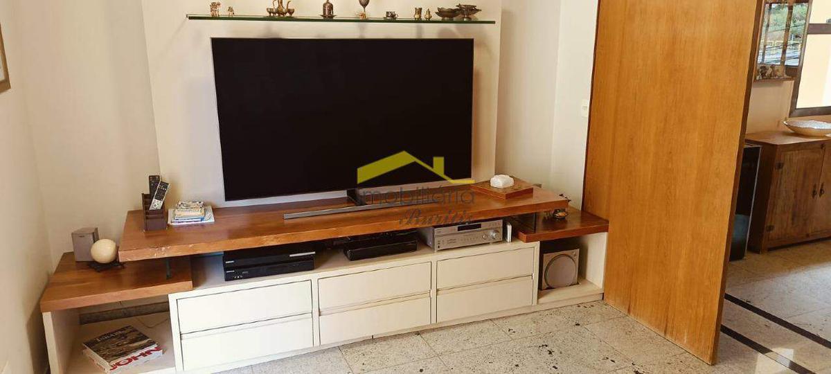 Segundo pavimento: Sala para 3 ambientes em granito. Lareira. Sala de TV. Lavabo em granito com bancada em granito. Ampla cozinha em granito com bancadas em granito, mesa e armários planejados. Despensa. Área de serviço independente em granito com bancada em granito. DCE. Área externa descoberta em pedra são tomé com piscina. Espaço gourmet em porcelanato com churrasqueira, banheiro, ducha e sauna.