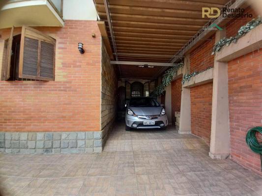Casa: Fachada gradeada com detalhes em madeira e jardins. 03 Vagas de garagem sendo 02 cobertas e 01 descoberta.