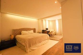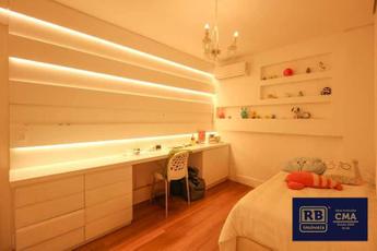 ¿ Quatro quartos com piso em laminado de madeira, armários planejados e ar-condicionado, sendo uma suíte máster com varanda, closet e banheira.