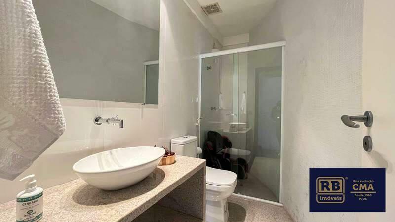 Banheiro social com acabamento de alto padrão em porcelanato, espelho e box em blindex.