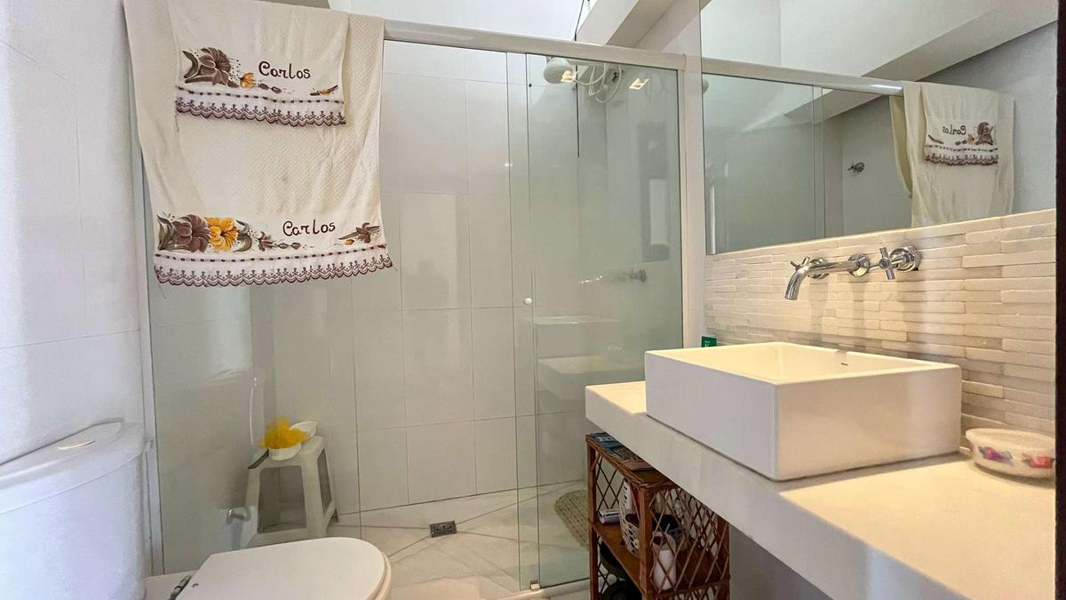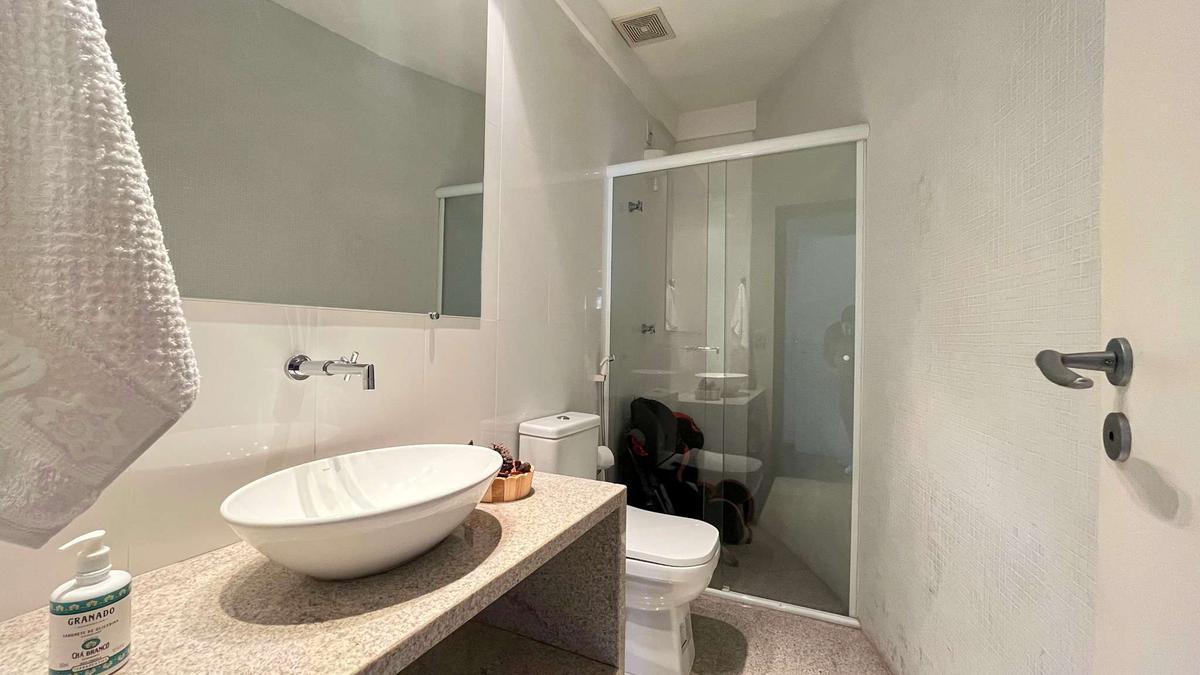 Banheiro social com acabamento de alto padrão em porcelanato, espelho e box em blindex.
