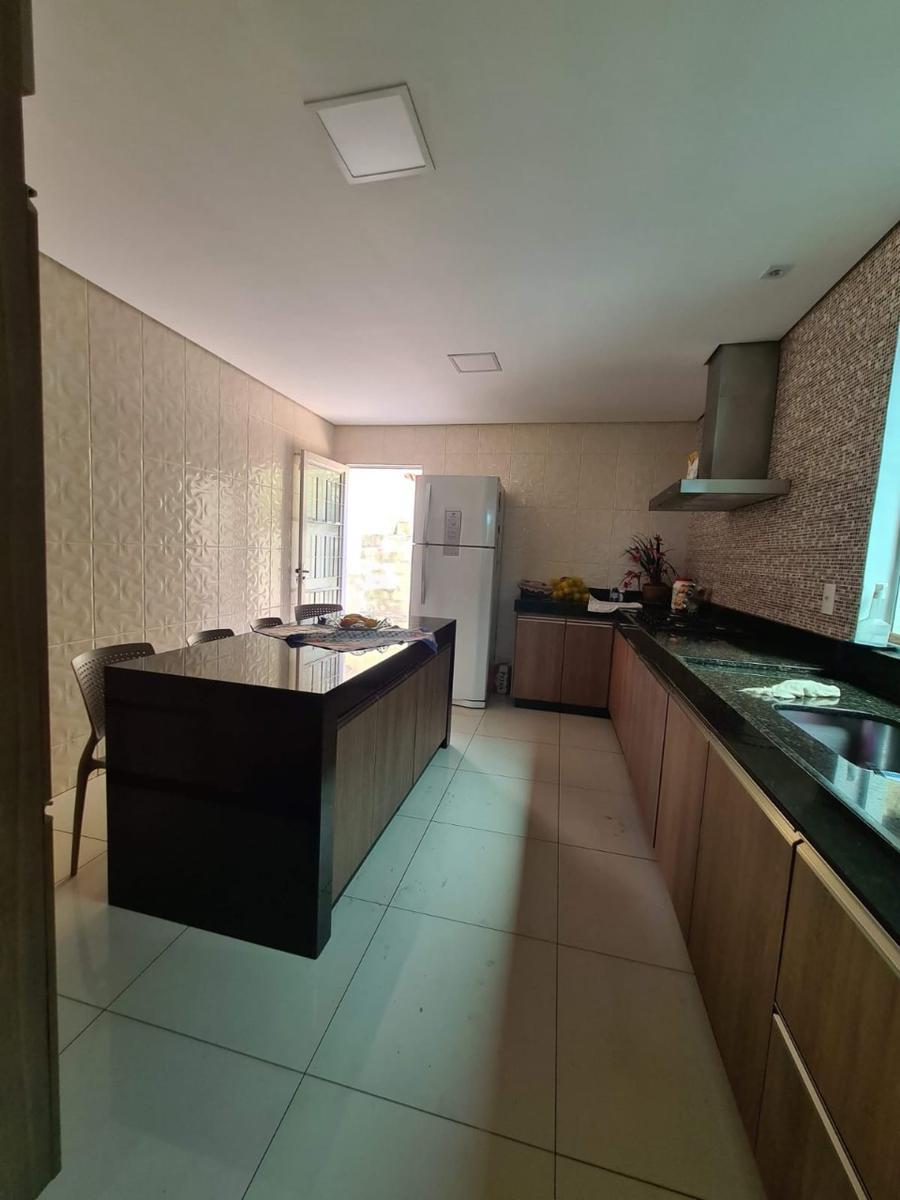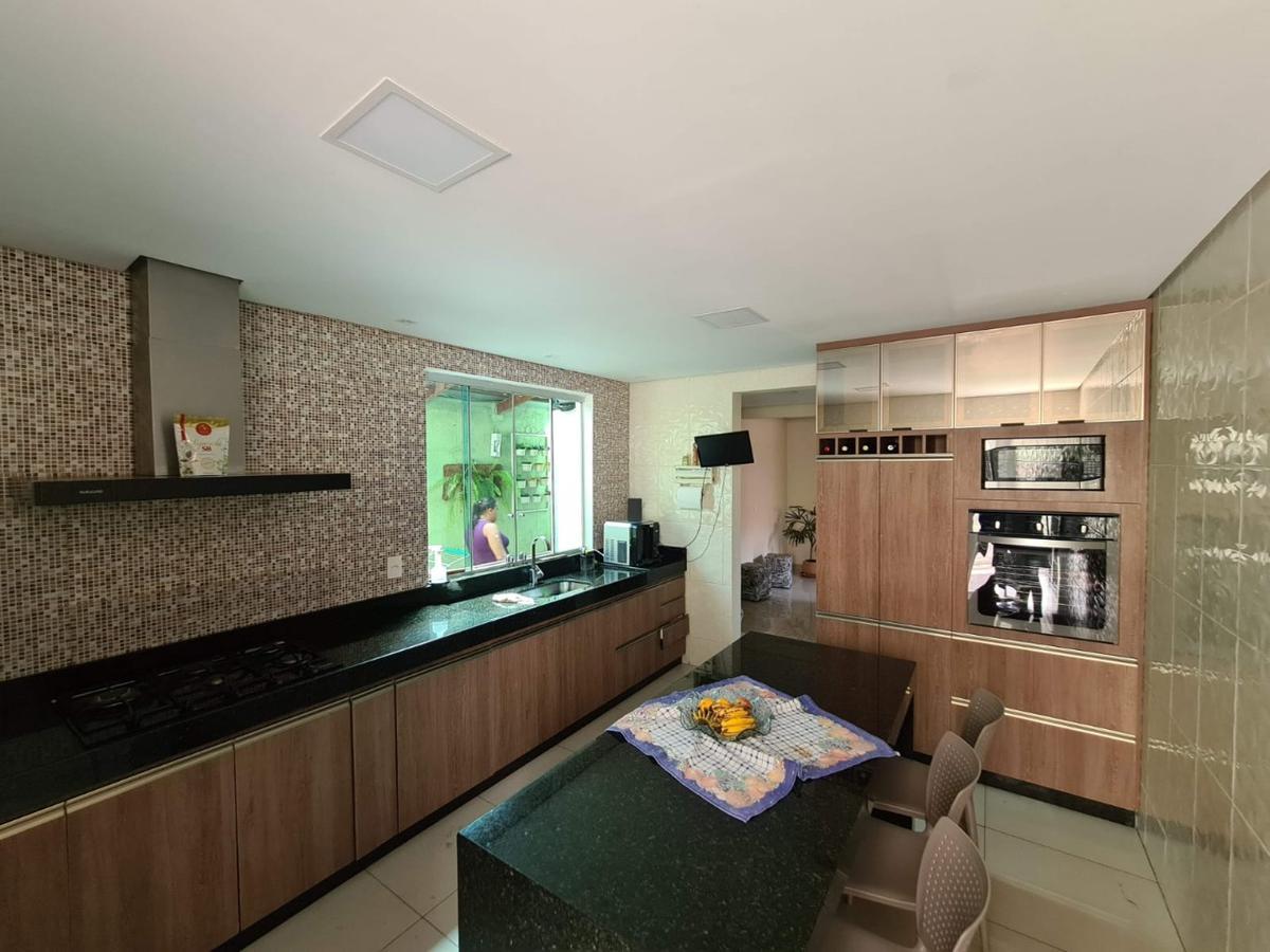 Cozinha ampla com móveis planejados, bancada em granito e mesa em granito