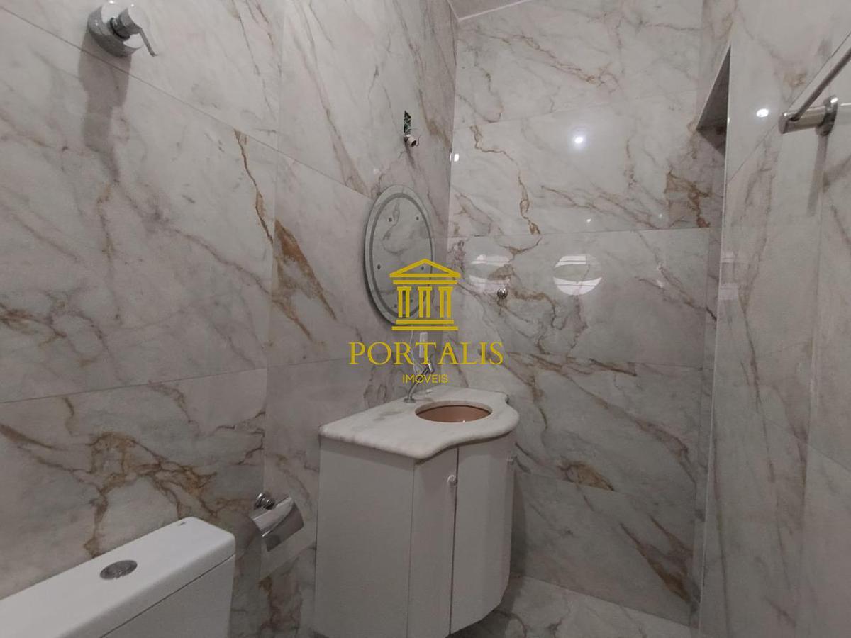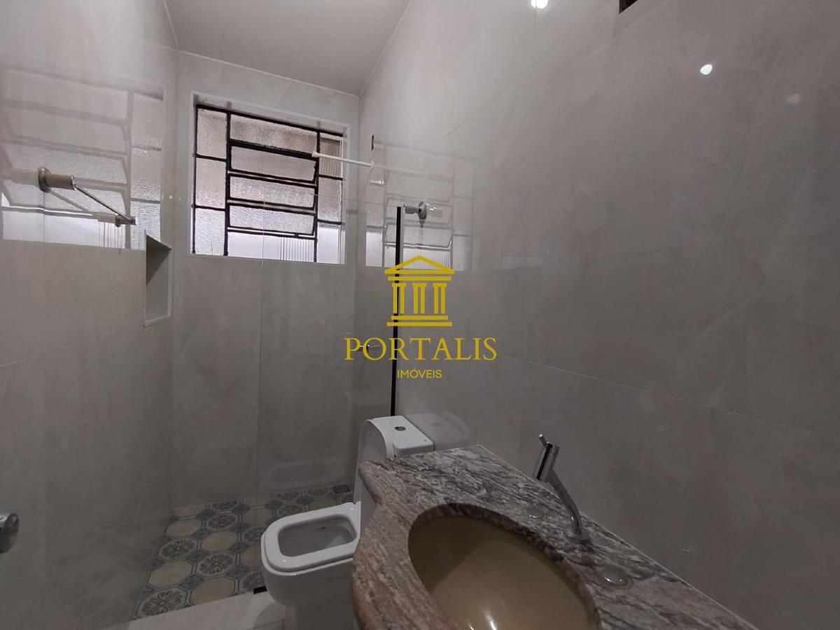 Banheiro social com box, bancada em granito e armário