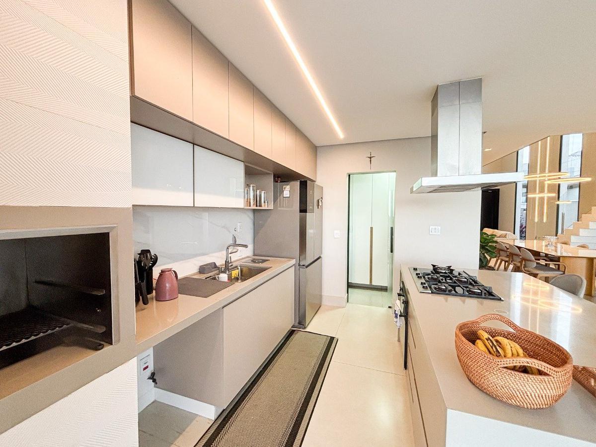 01 Cozinha com armários planejados, ilha com cooktop e coifa, moveis inclusos, geladeira nova com porta dupla Eletrolux;