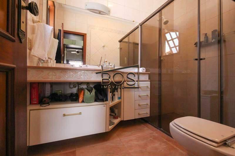 - Banheiro social com acabamento de alto padrão, espelho, armário e box em blindex.