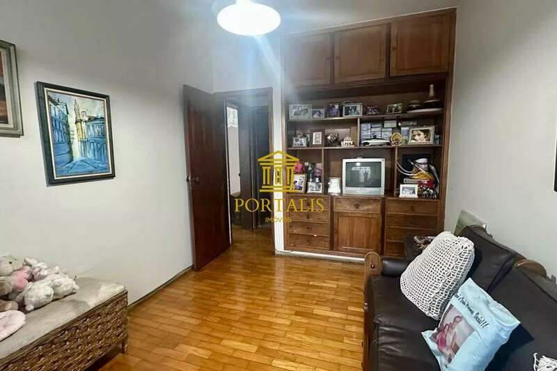 Sala de TV aconchegante com piso em taco.