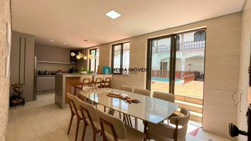 Sala de jantar com cristaleira, piso em porcelanato e jardim de inverno