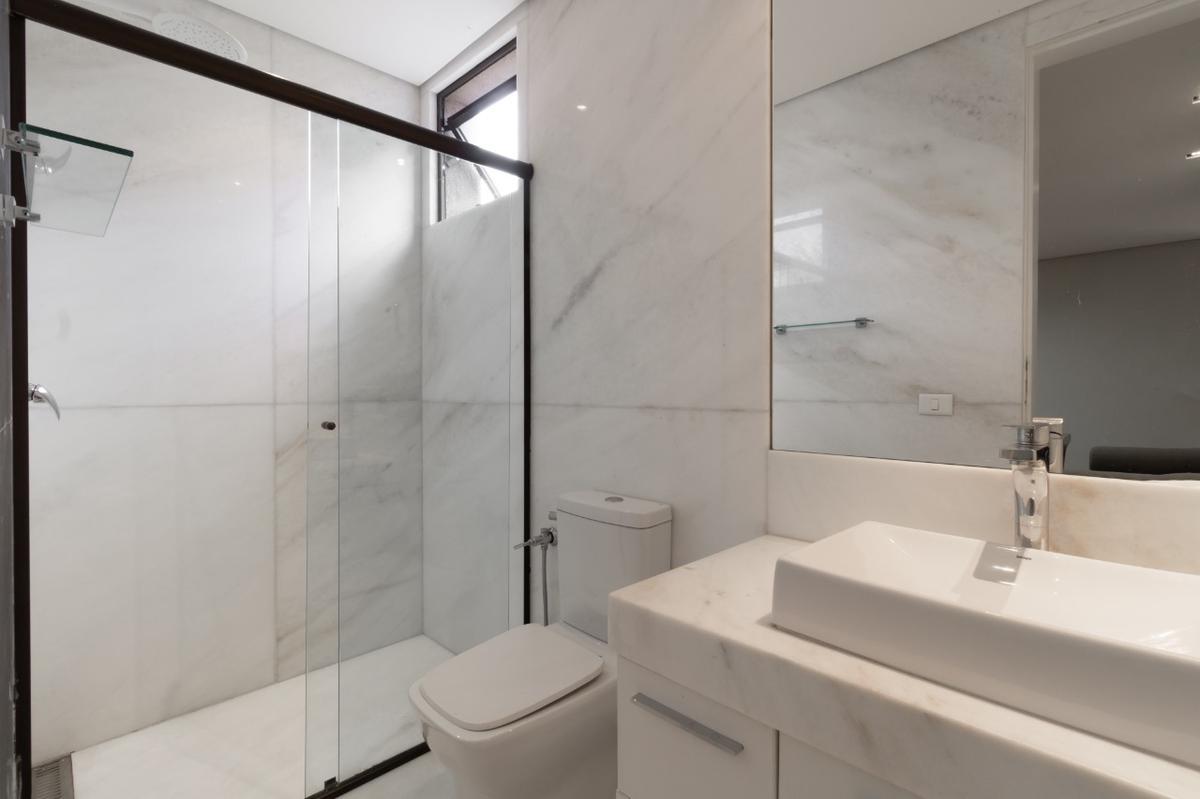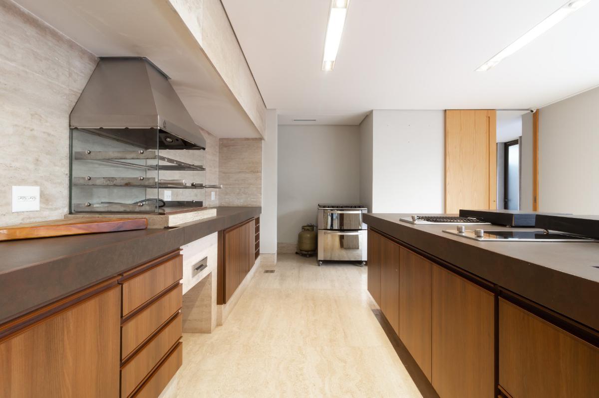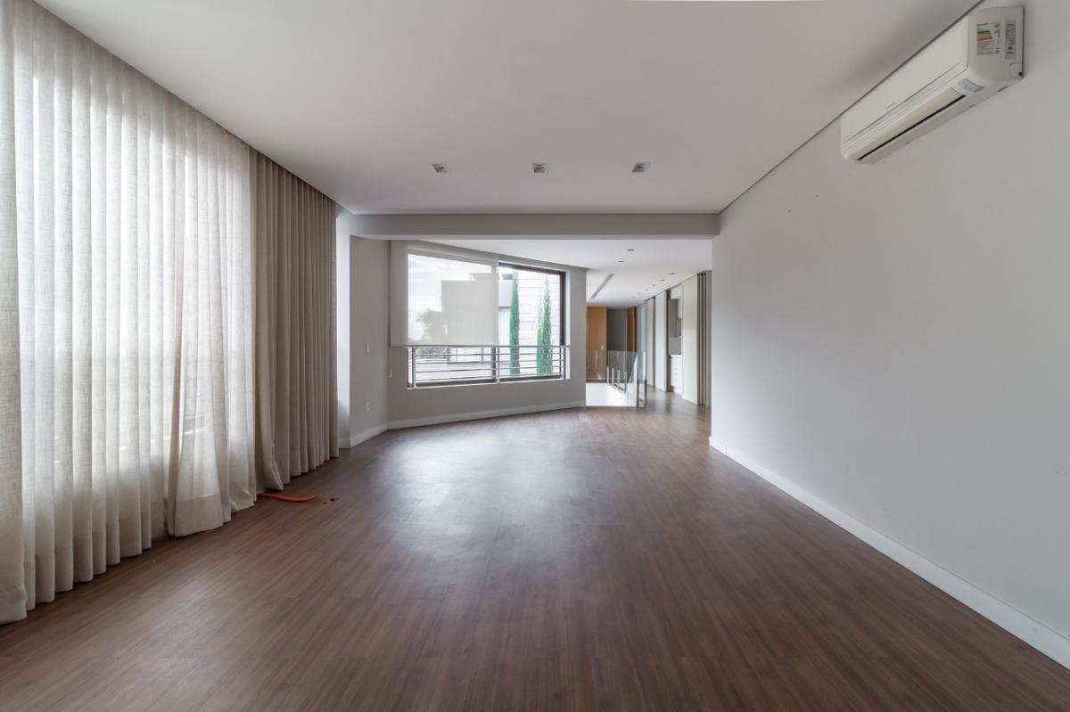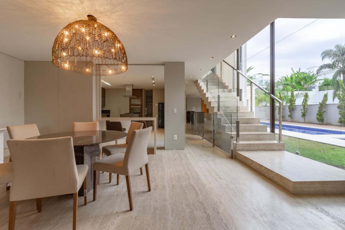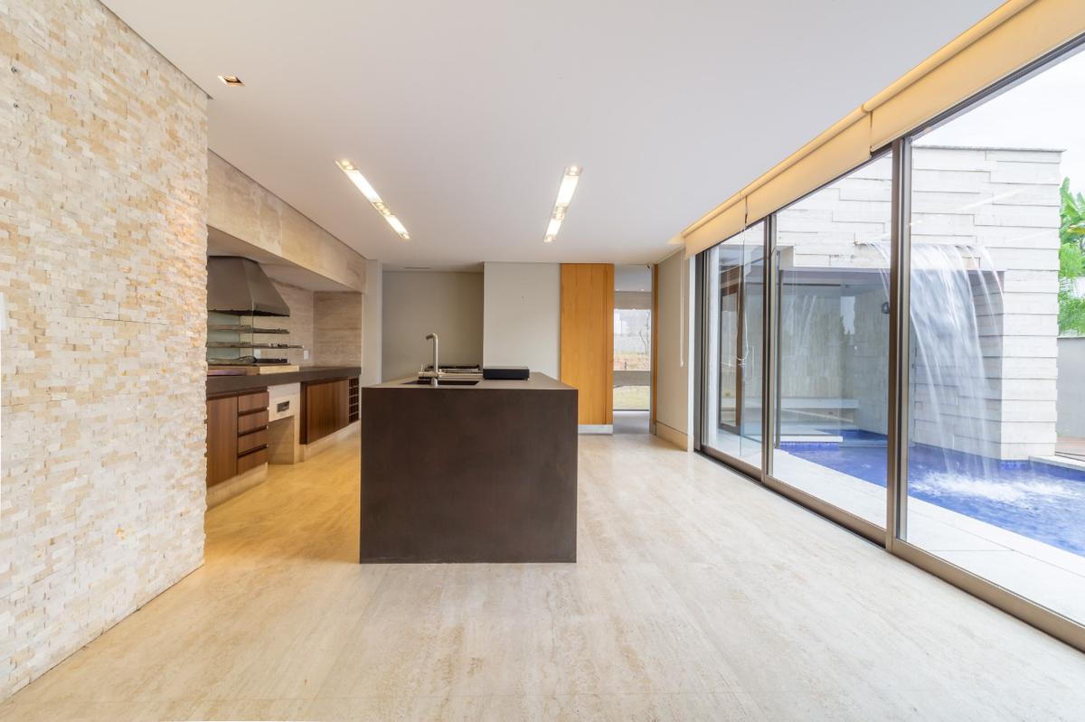 No segundo pavimento fica a área social do imóvel composto sala ampla para dois ambientes sendo um delas com lareira a gás, lavabo com bancada em mármore ônix, sala de tv, cômodo de despensa, sala de jantar, cozinha moderna planejada com armários, fogão cooktop, coifa e mesa para refeições embutida, suíte com closet, espaço gourmet com churrasqueira e espaço anexo à piscina, dois banheiros e um chuveiro, sauna conectada com a piscina, ducha na porta da sauna, piscina aquecida com cascata, piscina infantil com hidromassagem e quadra gramada no fundo.