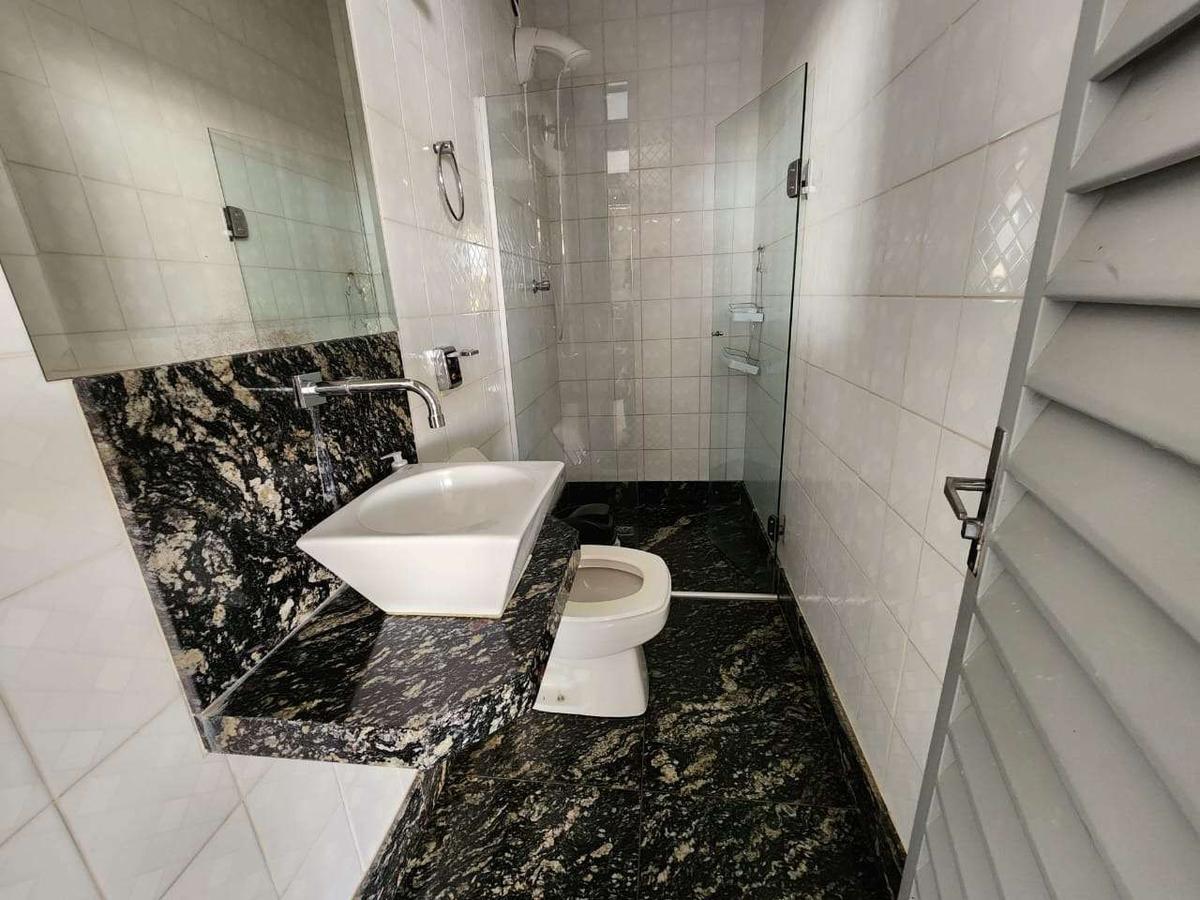 03 Banheiro social com armários sob bancada em granito, box de blindex e espelhos;