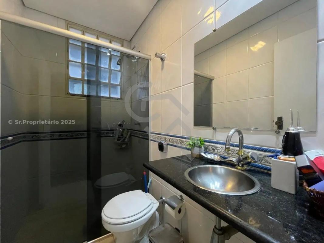 Banho social com excelente acabamento, espelho e box em blindex.