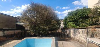 Quintal amplo com piscina revestida em azulejos.