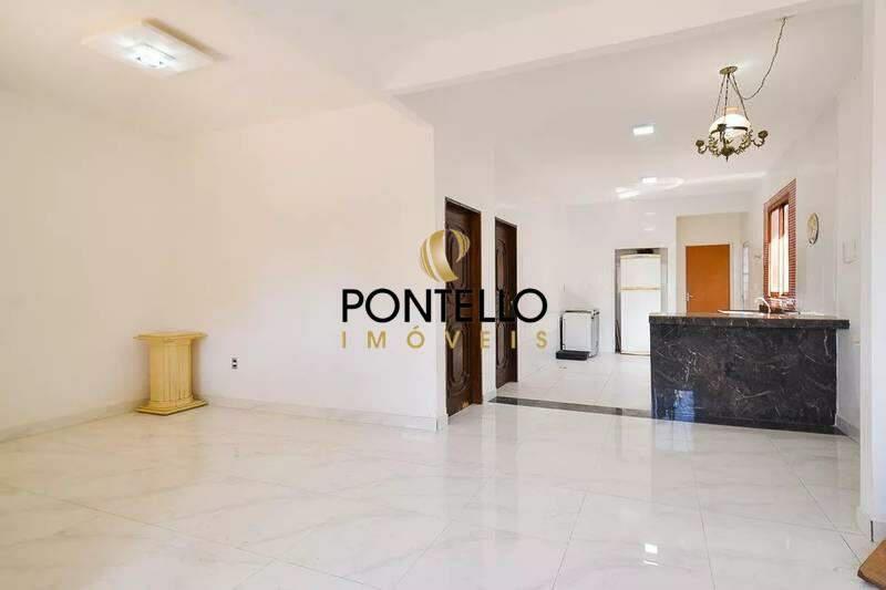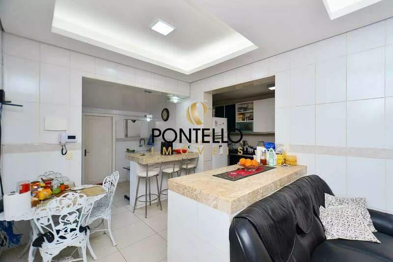Sala ampla para três ambientes, integrada à cozinha com bancada e pia em granito.
