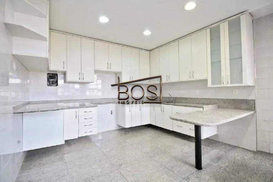-Cozinha ampla com piso e bancada em granito, toda montada com armários.