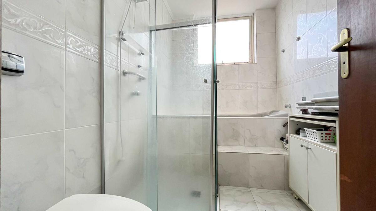 2 quartos com armários planejados e piso em taco de madeira, sendo 1 suíte com box em blindex e espelho.