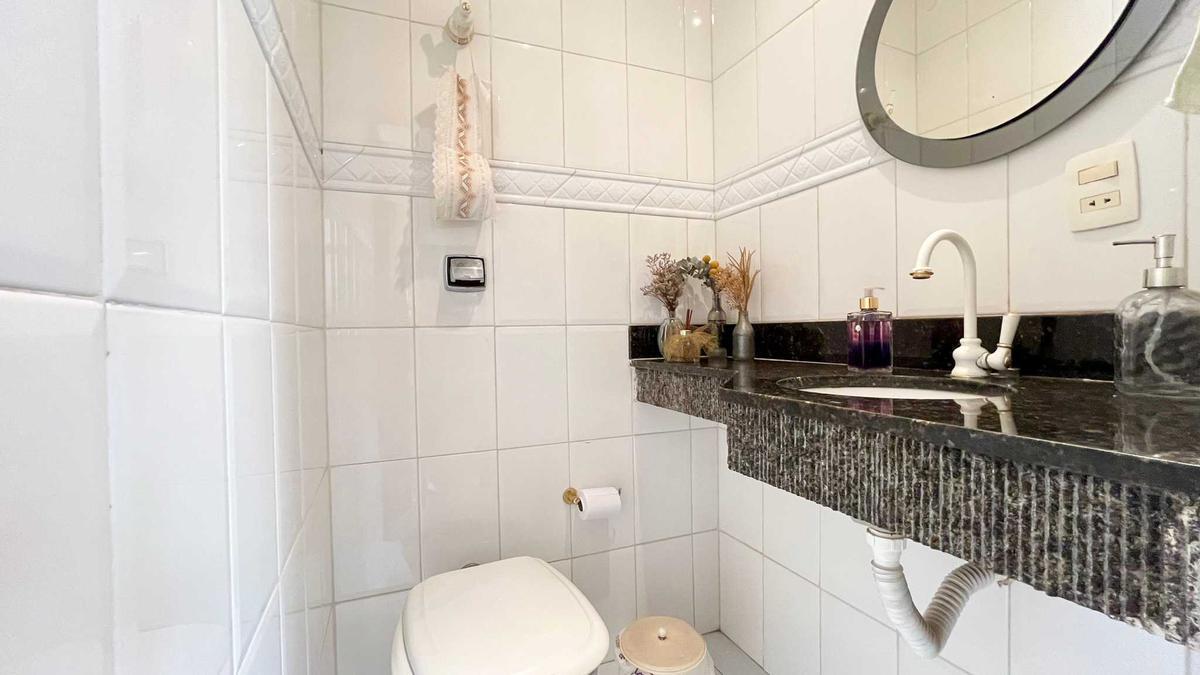 Banheiro social com box em blindex e espelho.