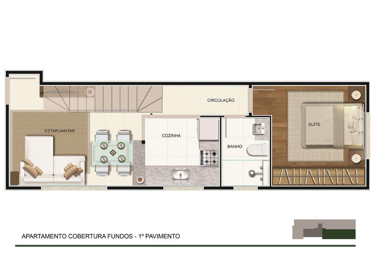 Apartamento cobertura composto no primeiro piso com 01 quarto, sala cozinha banheiro e no segundo pavenidaimento com sala, lavenidaabo e terraço descoberto com área serviço. 02 vagas cobertas. prédio com elevador, água e gás com medição individual!