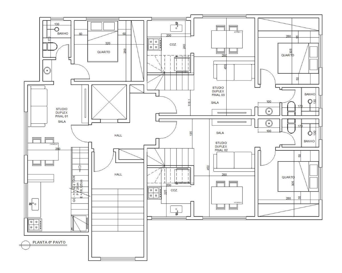 Cobertura duplex com 74,50 m² ( 52,00 + 22,50m²) de área construída com fino acabamento composto no primeiro pavimento com 01 quarto, sala, banho social, e cozinha e no segundo pavimento com sala, lavabo e área livre descoberta com área serviço.