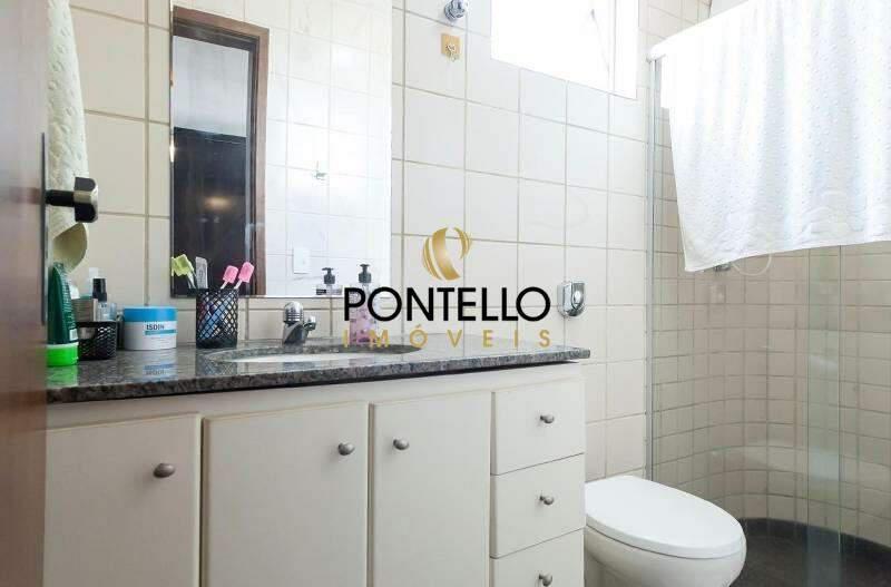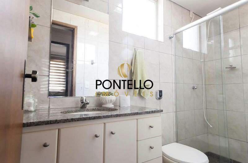 Banheiro social com bancada em granito, espelho, armários planejados e box em blindex