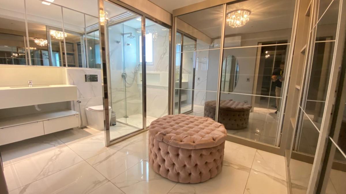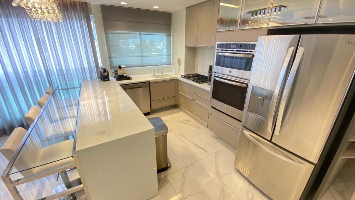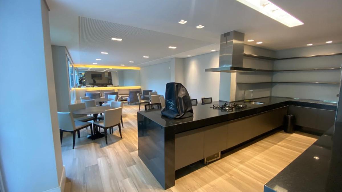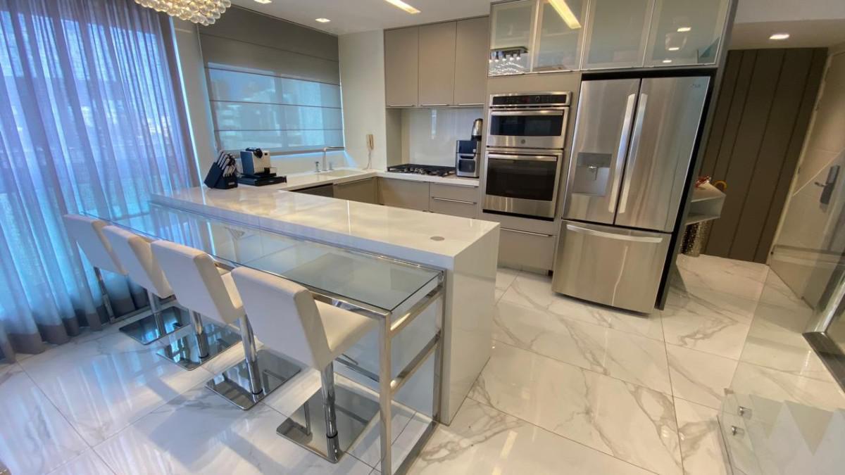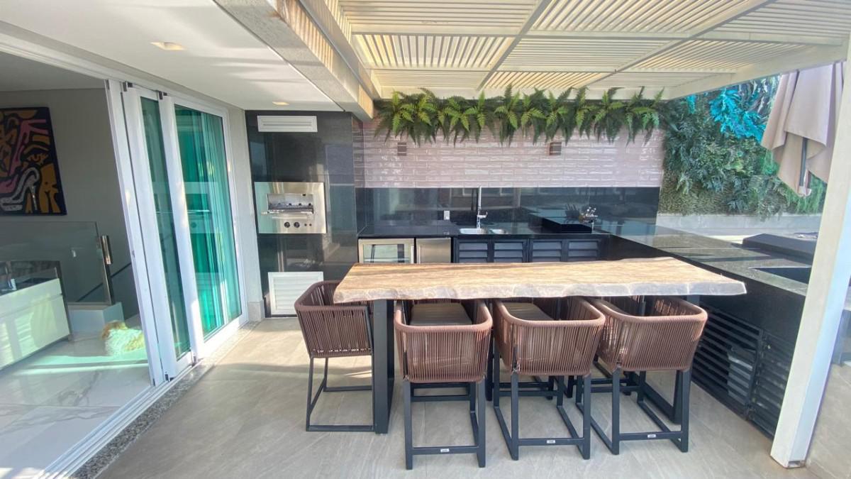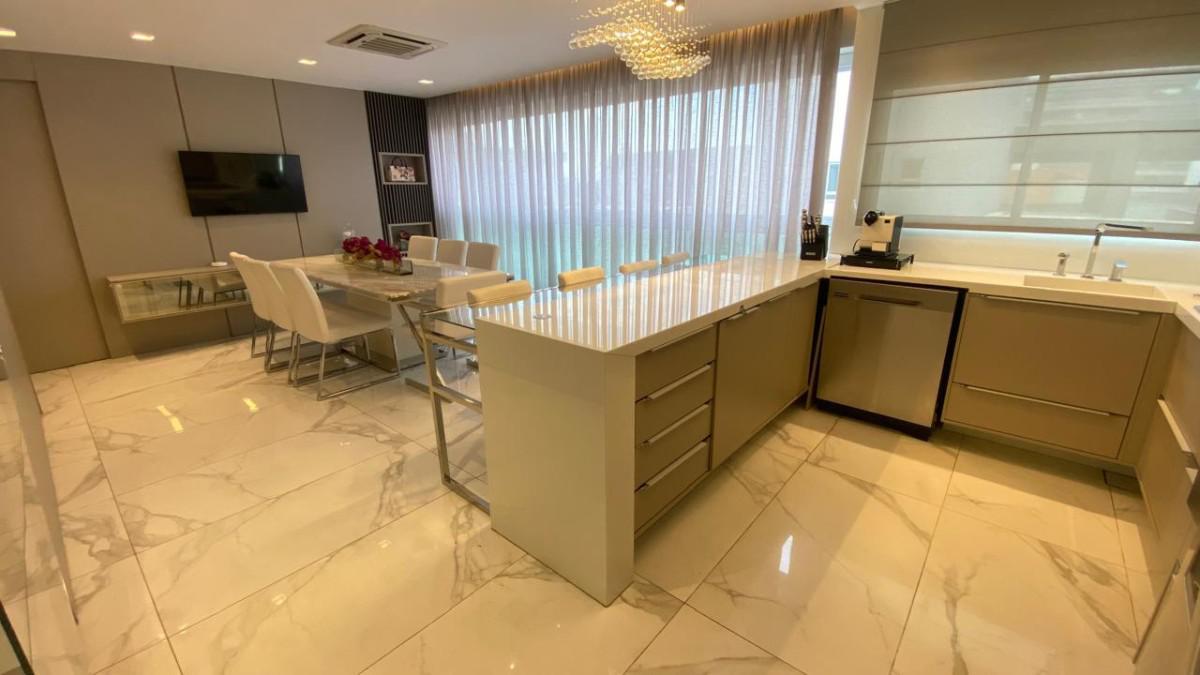 Cozinha americana com bancadas em silestone e marcenaria premium. Suíte com closet, rouparia e janelas com venezianas.
