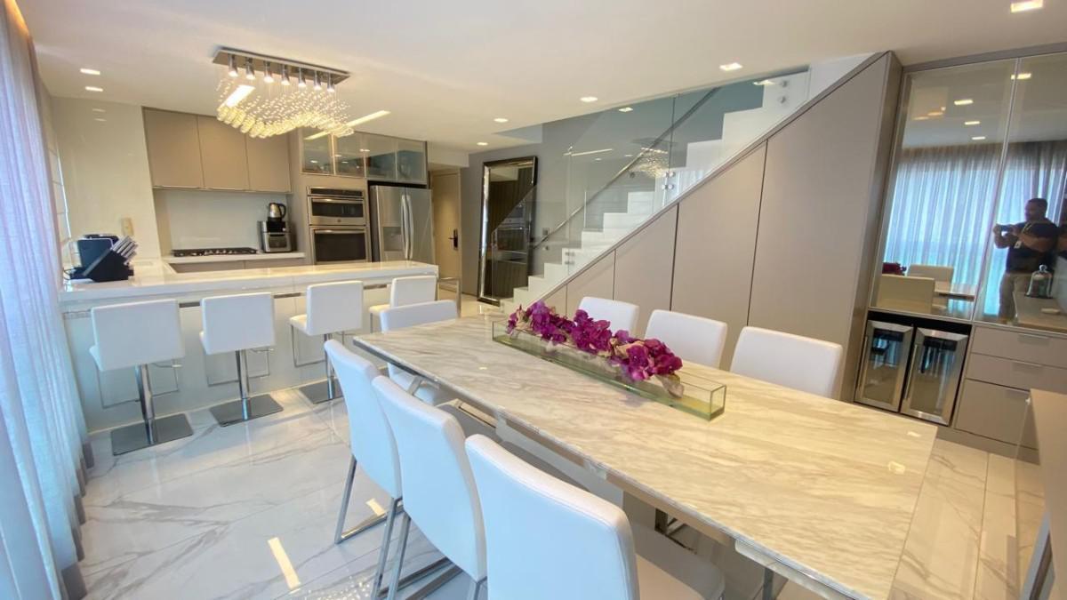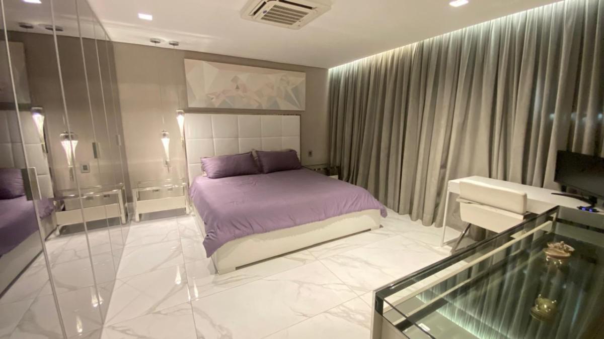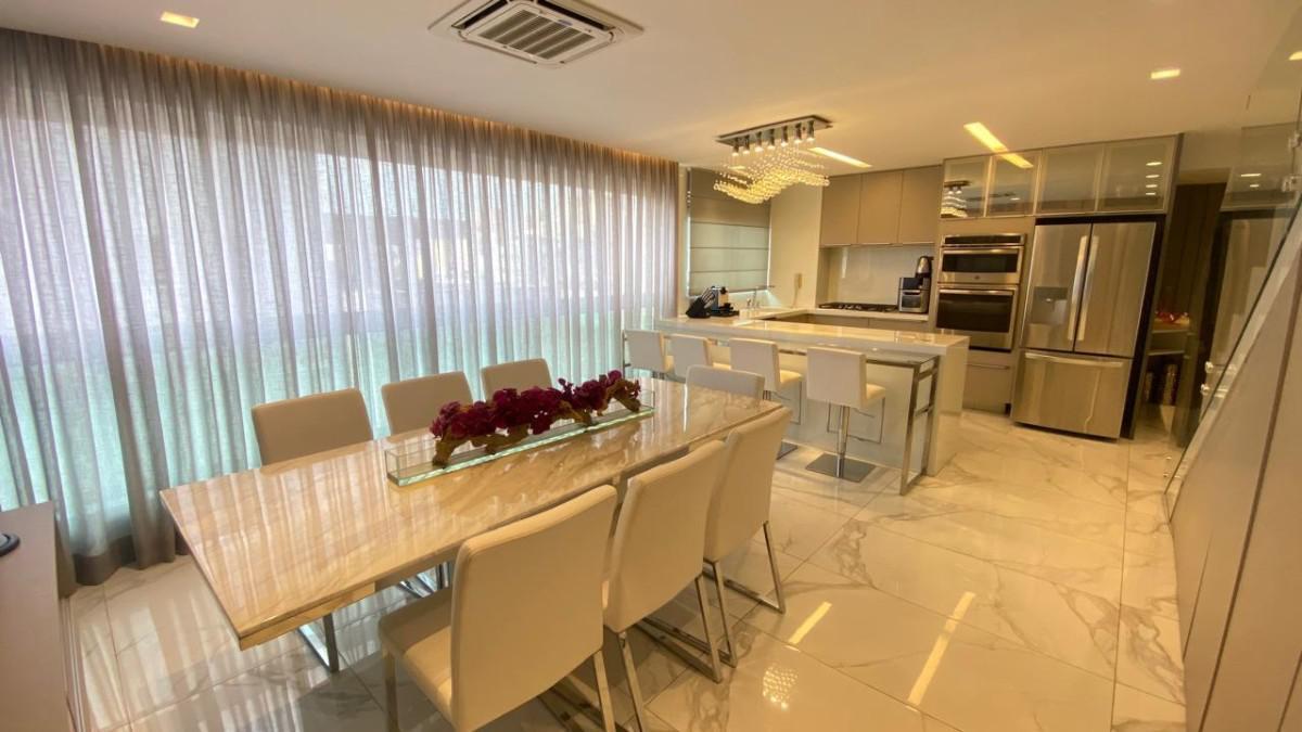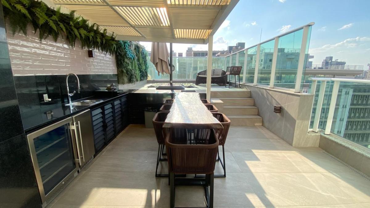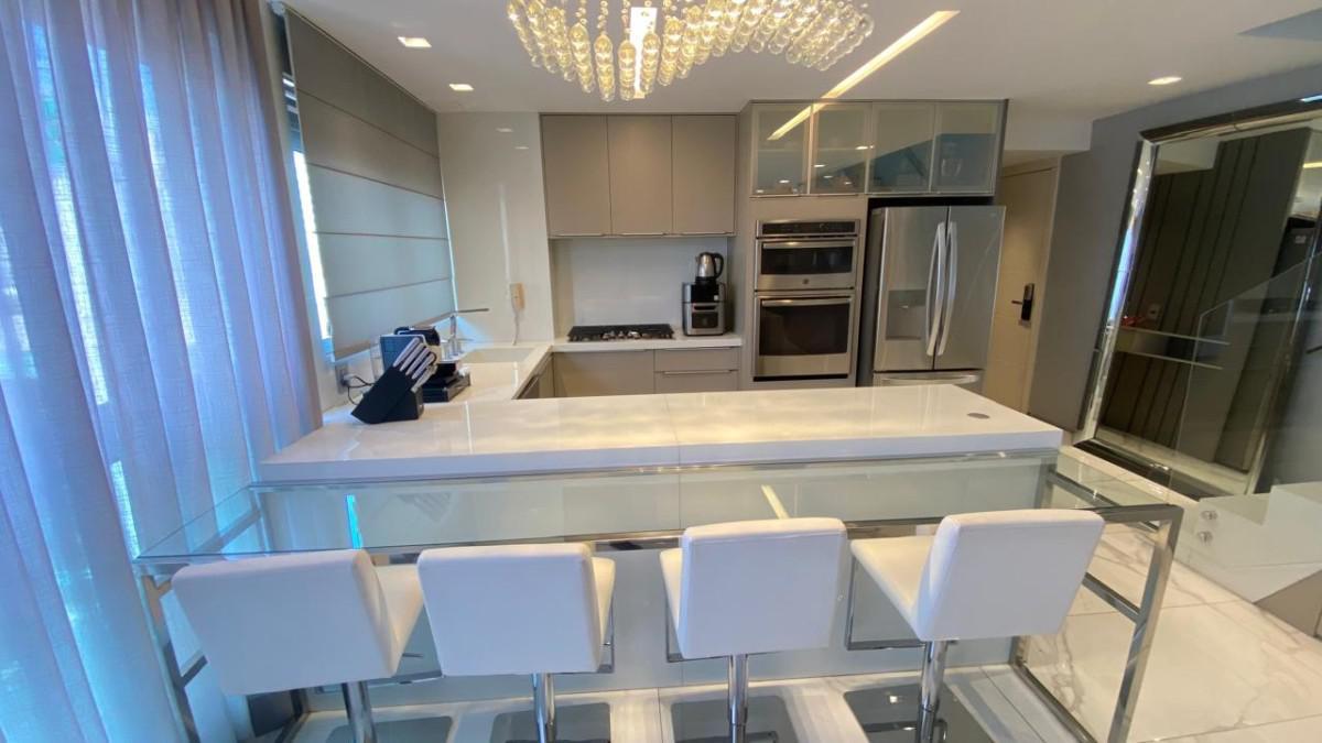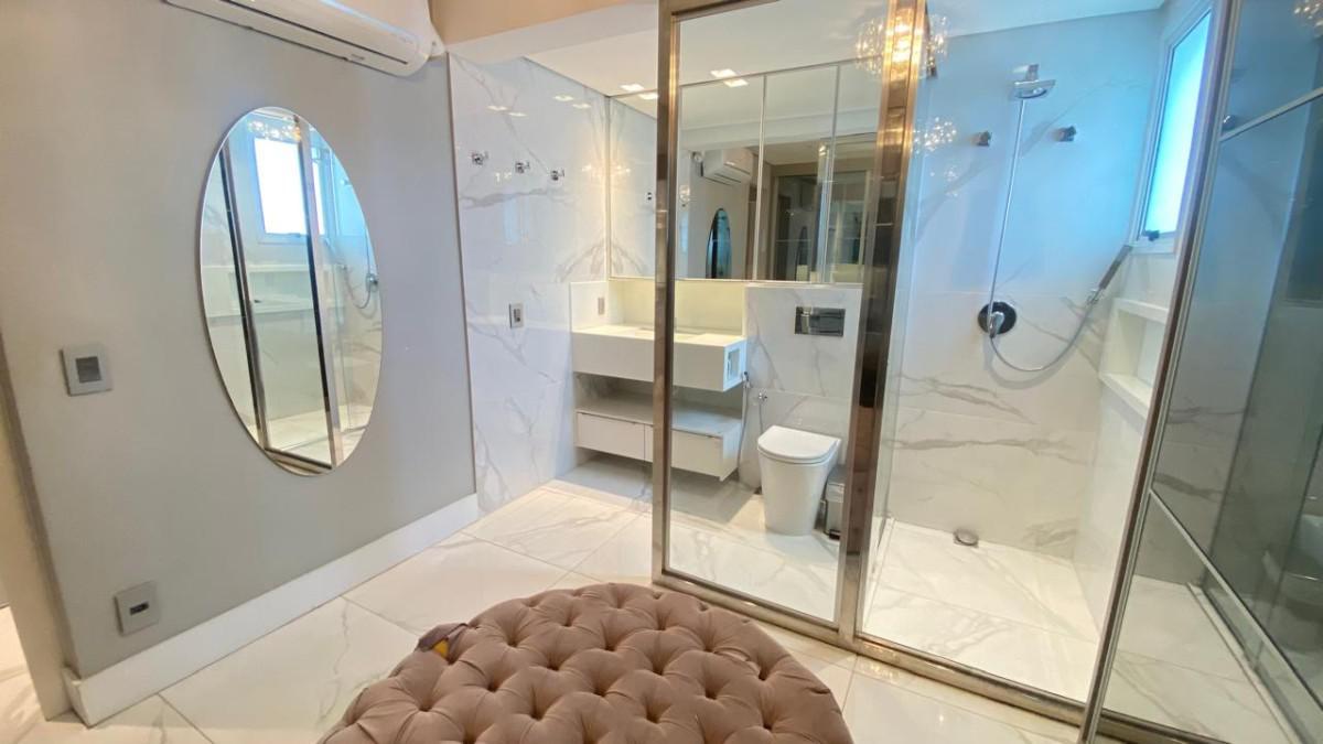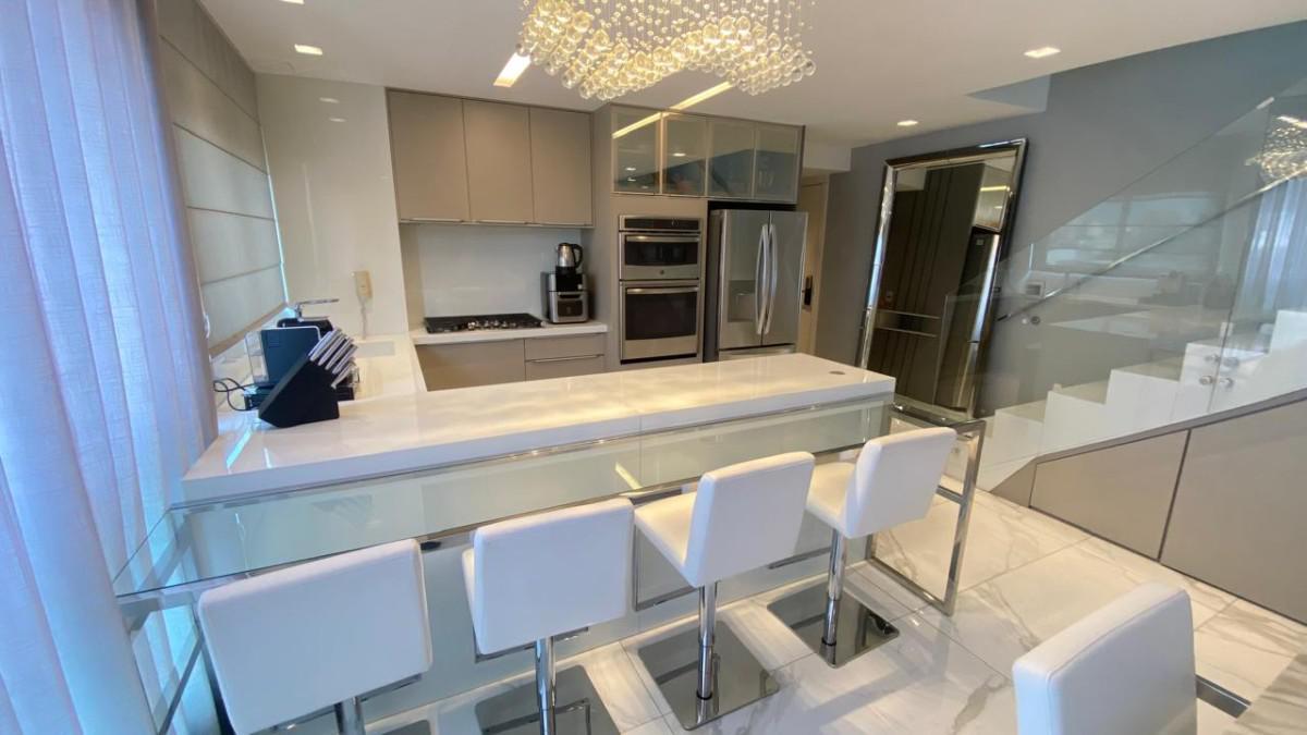 Cozinha americana com bancadas em silestone e marcenaria premium. Suíte com closet, rouparia e janelas com venezianas.
