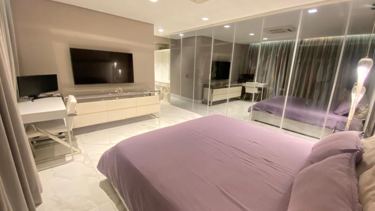 Sala com espaço generoso com armários, cristaleira e painéis;