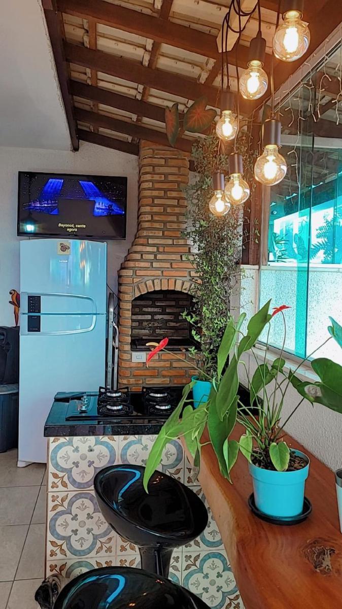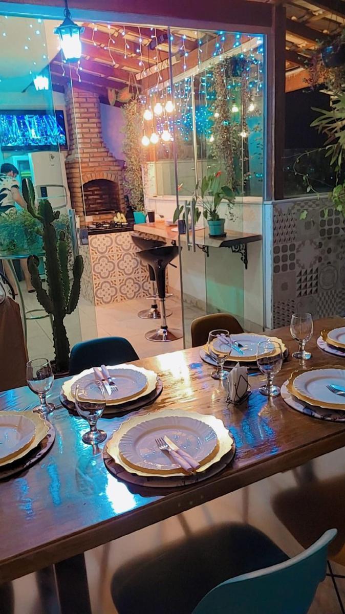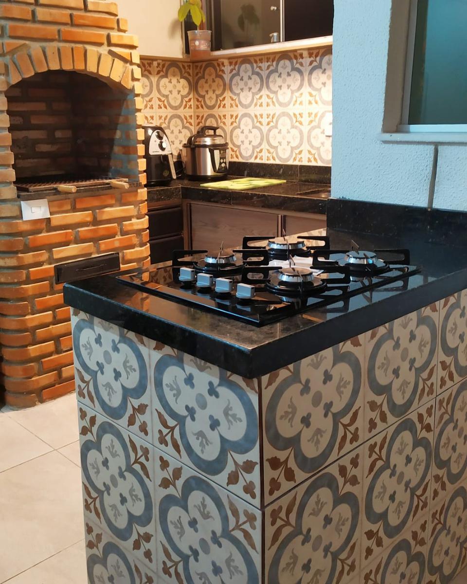 - Área Gourmet com Churrasqueira de Tijolinho e Bancada de Granito com Porta de Vidro Para a Varanda.