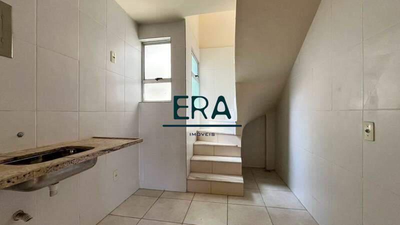 Cozinha espaçosa com piso em cerâmica e bancada em granito, possui a escadaria para o segundo andar