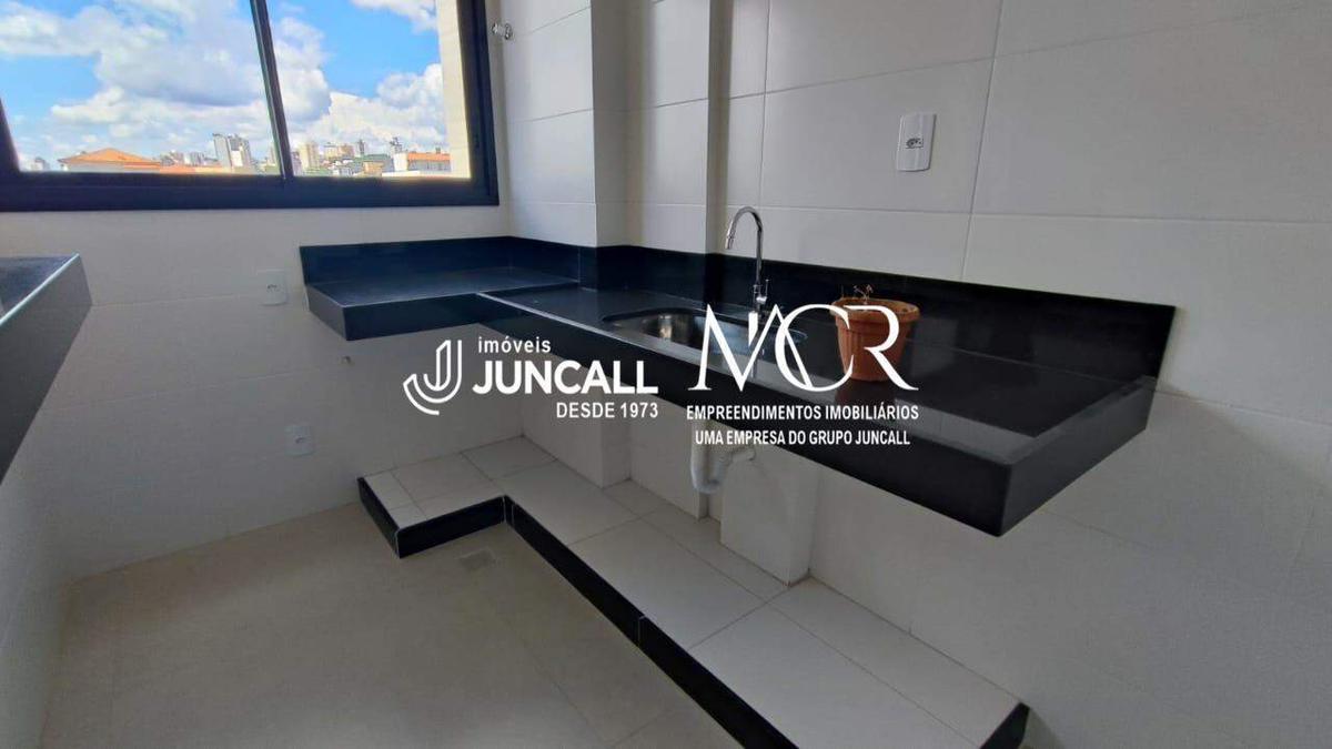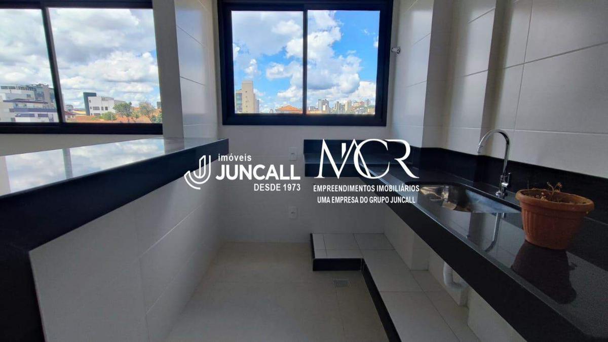 Cozinha americana com bancada de granito e área de serviço conjugada.