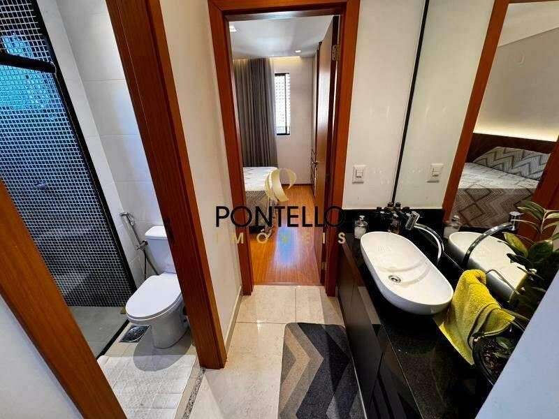 Banhos das suítes com bancada em granito, armário, espelho e box em blindex.