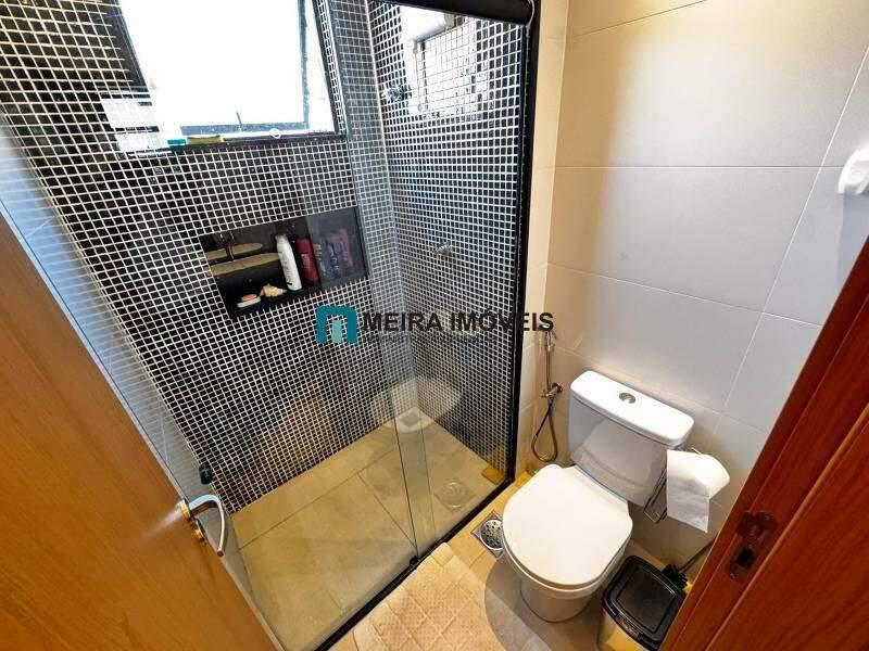 Banhos das suítes com bancada em granito, armário, espelho e box em blindex.