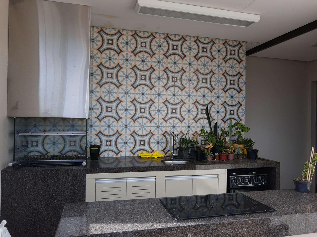Área externa 100% coberta com espaço gourmet: churrasqueira, ilha com fogão de indução embutido e fechamento em cortina de vidro