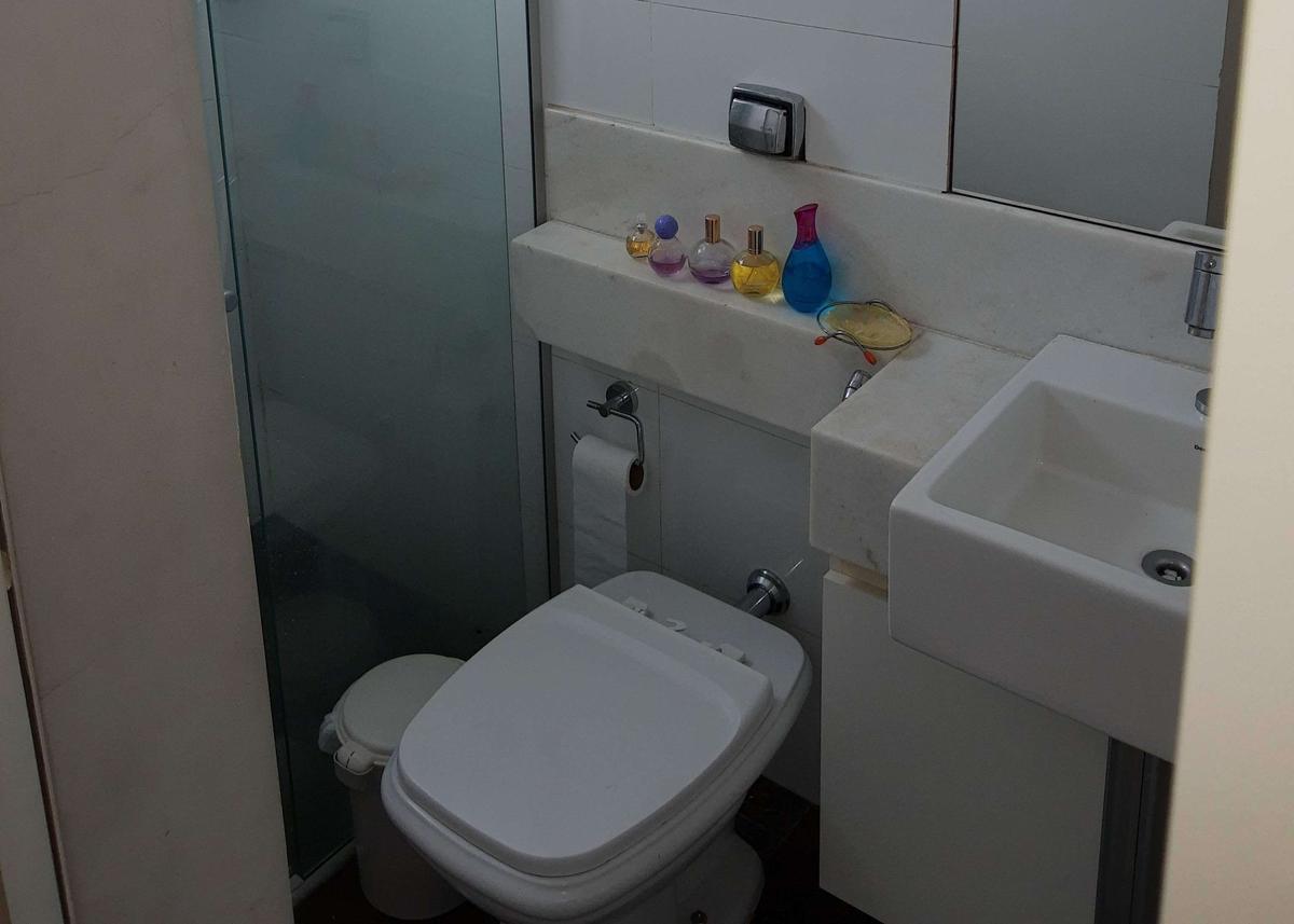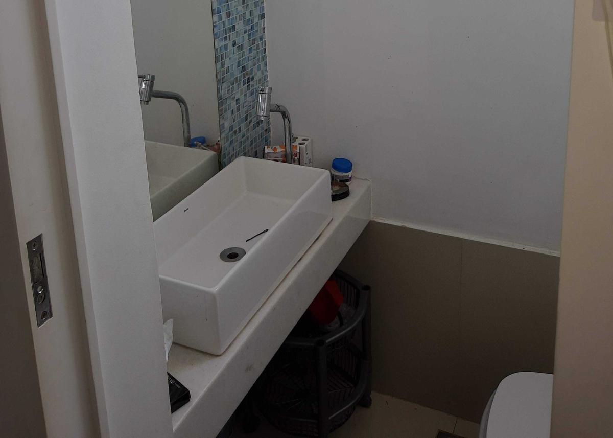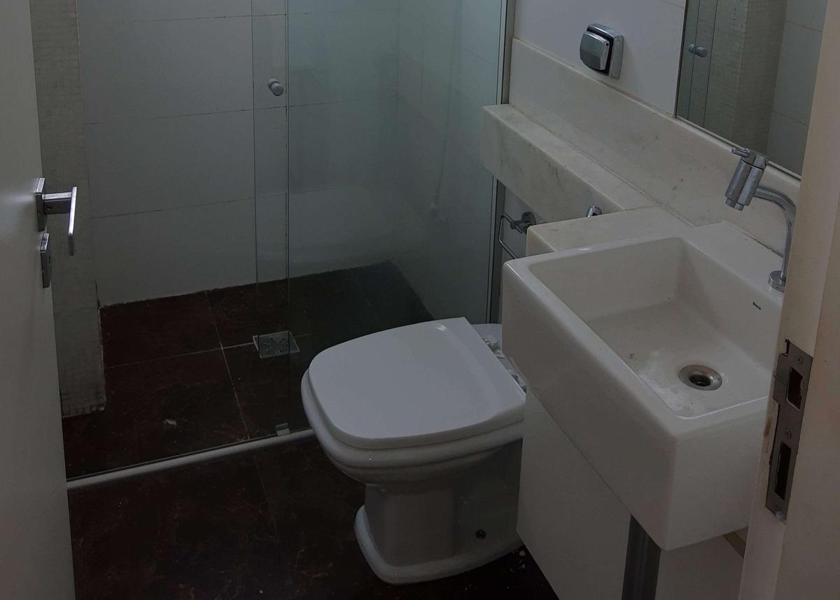 Banheiro da suíte com armário e box em blindex