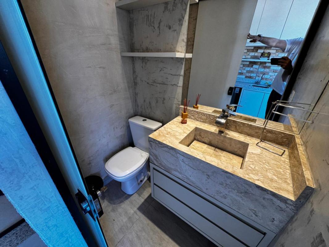 Banhos das suítes com bancada em granito, armário, espelho e box em blindex.