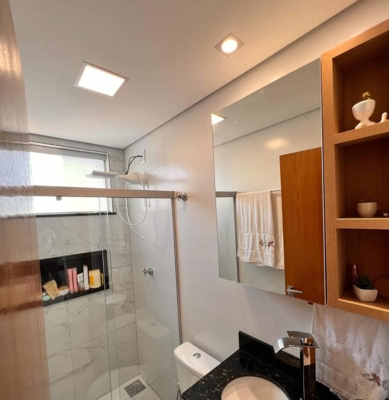 Banho social com armário, box blindex, e nicho na área do banho;