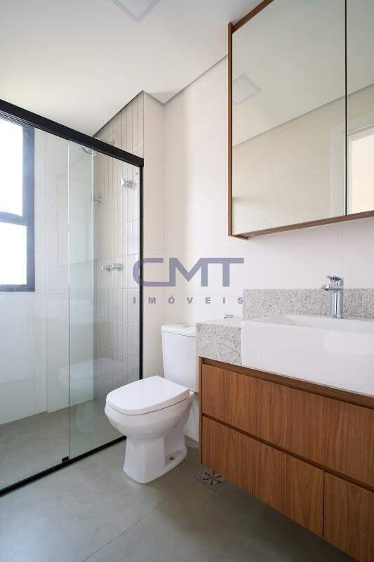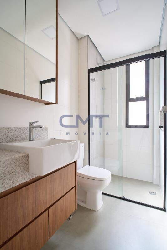 2 amplas suítes. Ambas com box em blindex transparente, armários planejados, piso em porcelanato, bancada em granito e cuba sobreposta.