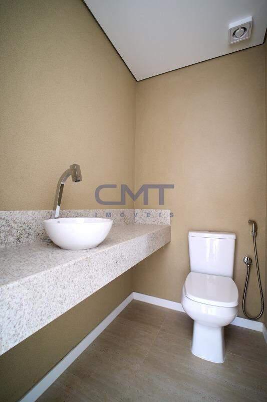 Sala para 2 ambientes com piso em porcelanato, e teto com rebaixamento. Ambiente conta com lavabo com bancada em granito e cuba sobreposta.