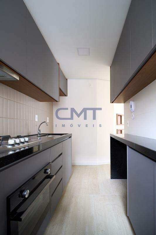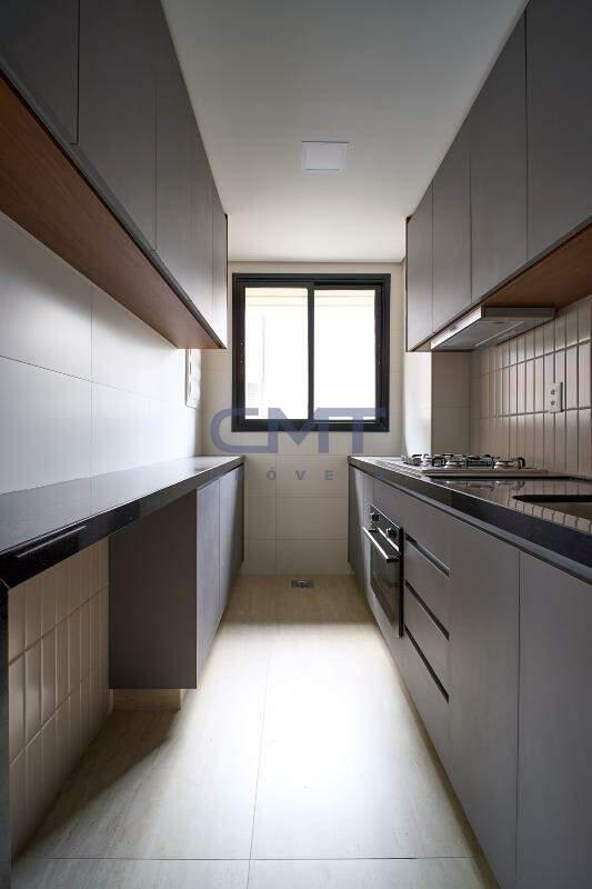 Cozinha com piso em porcelanato e bancadas em granito e armários planejados.