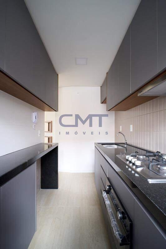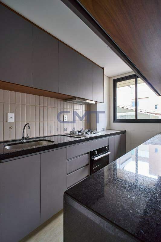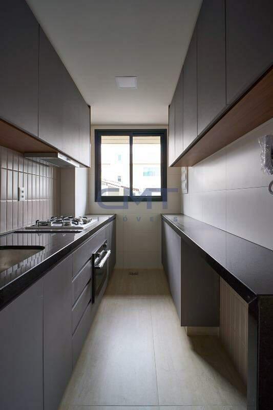 Cozinha com piso em porcelanato e bancadas em granito e armários planejados.